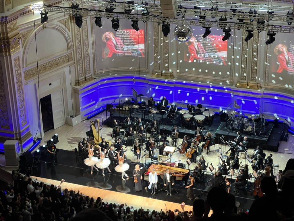 此次演出,虽然是在Carnegie Hall主厅,但和往常的古典明亮有所不同,这次布景主题使用的是淡蓝色,背后的乐团虽不庞大,但依然精巧有秩。我猜测演出后期会有摇滚、流行音乐会的灯光作为辅助,有些让人期待! 🙂